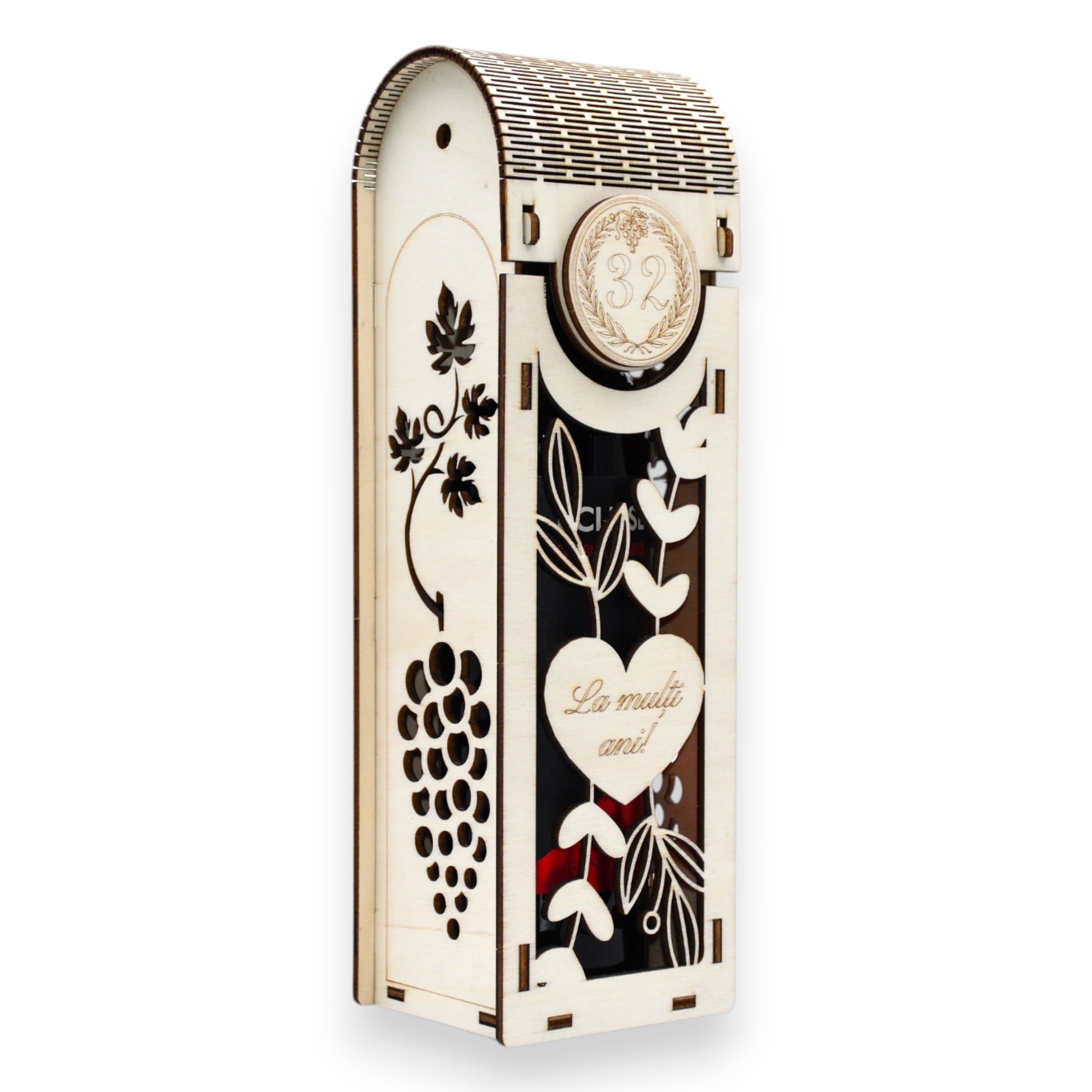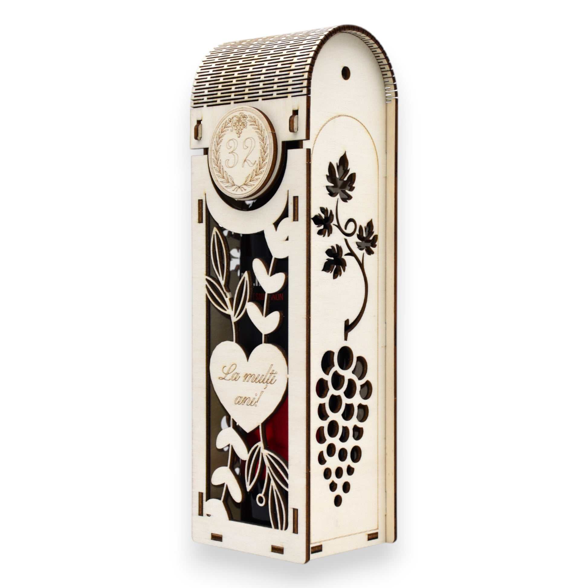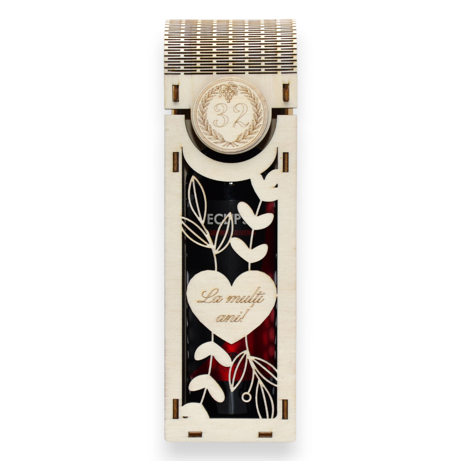 Cutie vin gravată “La mulți ani!” - motiv viță de vie & struguri