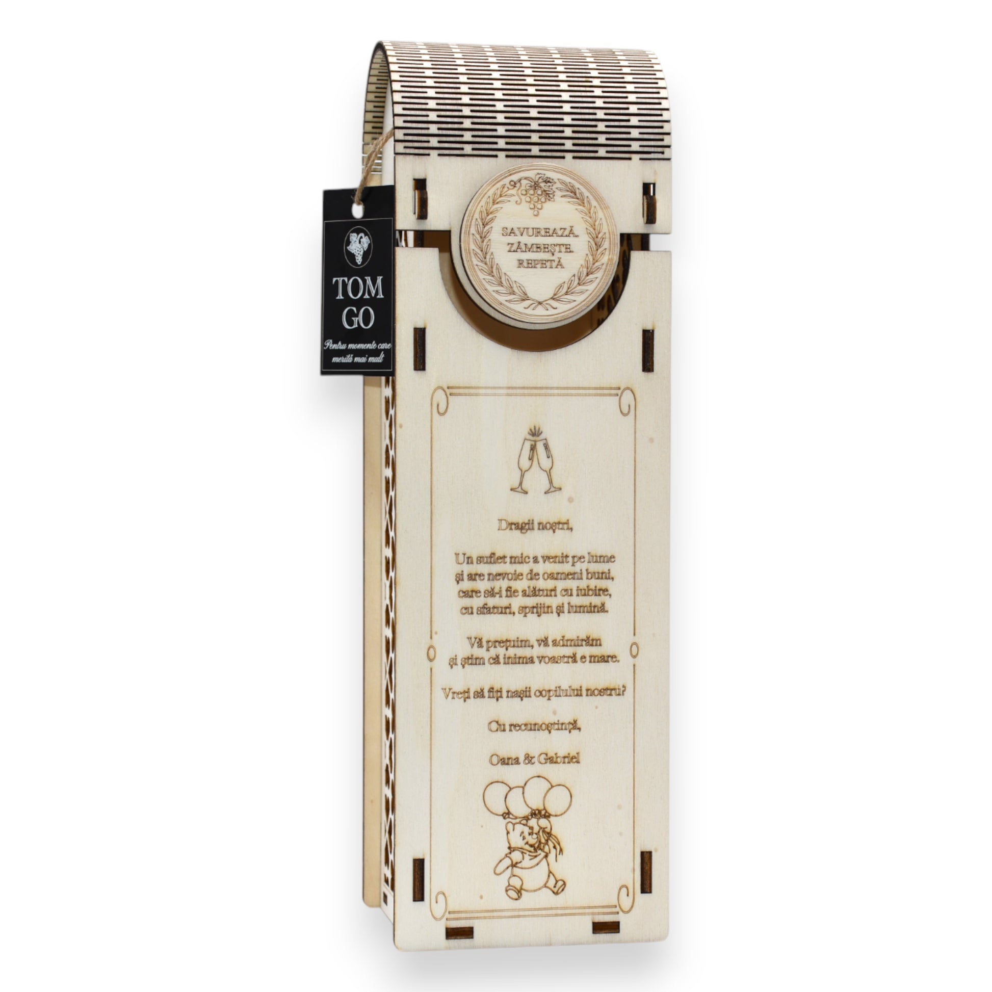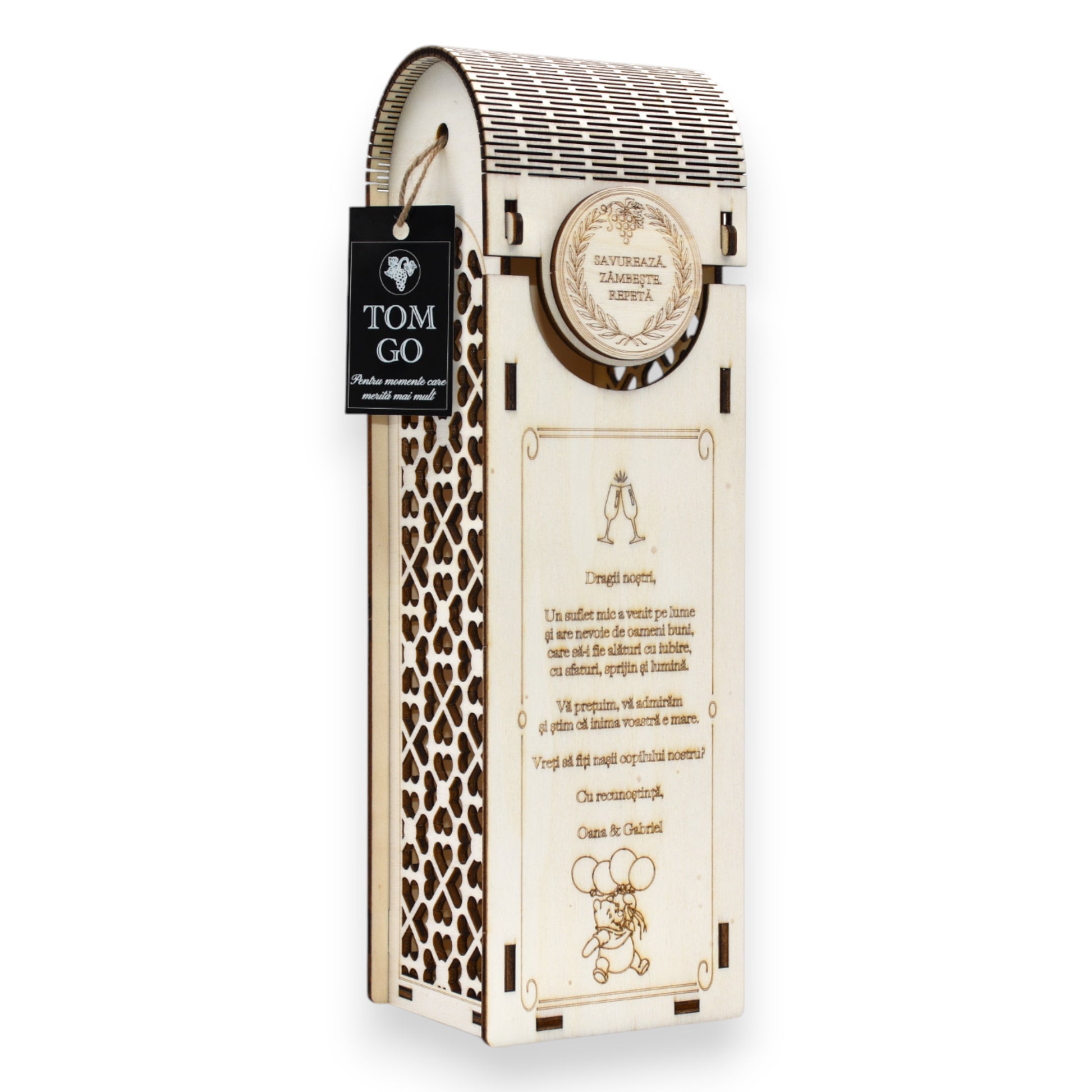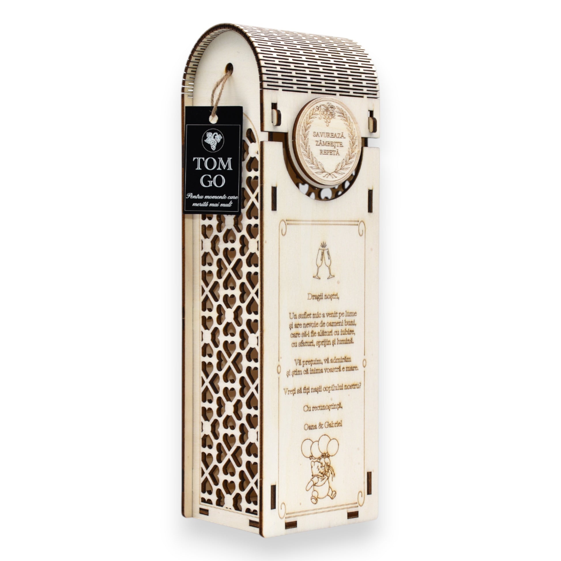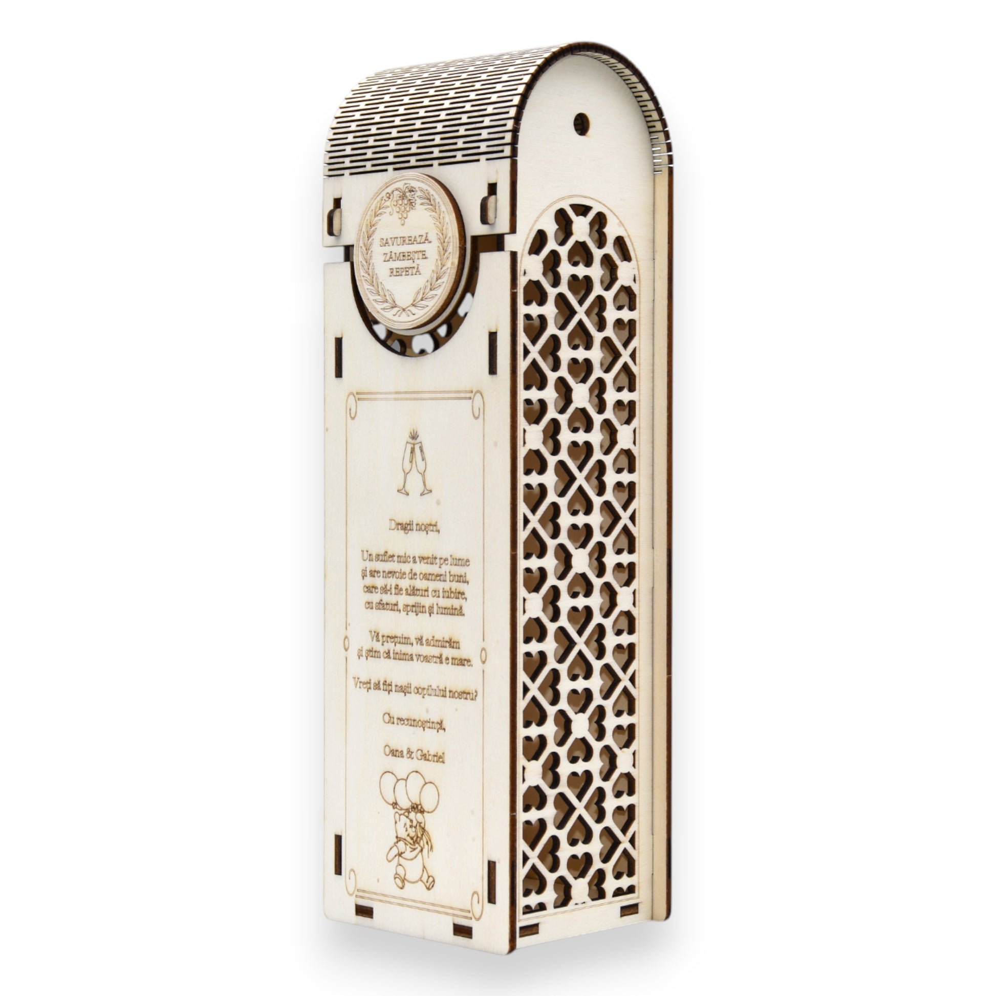 Cutie vin - propunere nași botez & model elegant cu inimioare